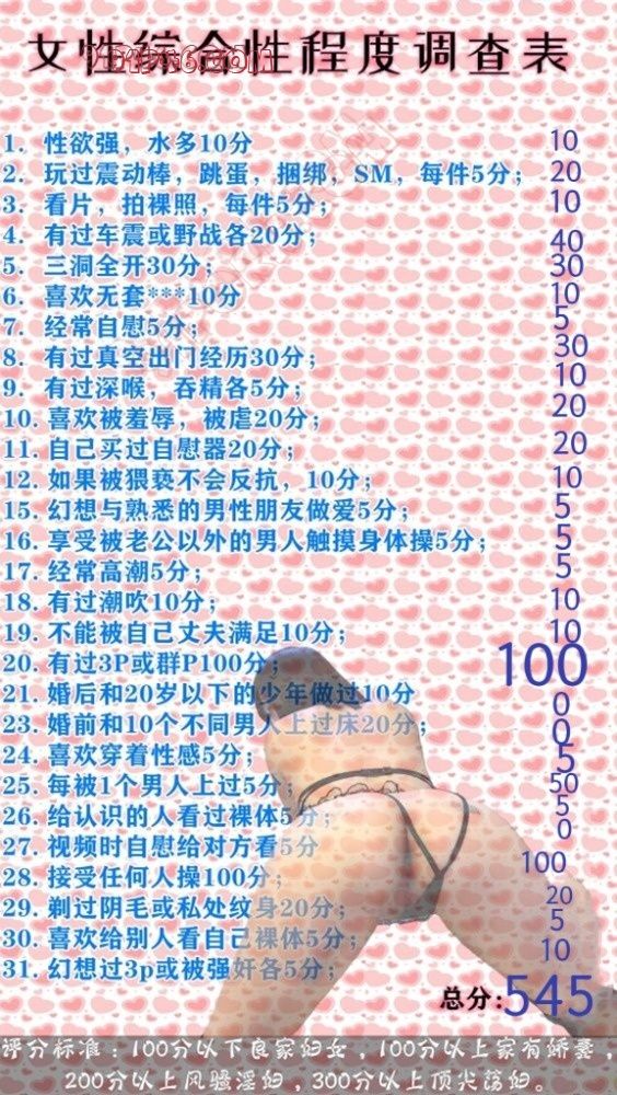 一直想写一下这些年来的淫妻之路,每次又不知道从哪开始,从骚妻16岁被我破处到现在可以接受任何人操,中间的故事很多,也花了很多的心思,有此骚妻,值得一辈子疼爱。骚妻小名为雪雪,28-163-108-80D国企工作,童颜巨乳,重度丝袜高跟鞋控,一年四季丝袜高跟不离腿,家里丝袜高跟鞋数百双,借由论坛里两位大佬的测试题展开开发骚妻12年的历程吧,从破处开始到网络约炮再到睡了半个分公司的男同事,故事很多会陆续更新。骚妻要颜值有颜值,要身材有身材,要老公有在座留言内射的各位。先上两个测试评分表,都是骚妻自己答题的,还有两张和同事的文爱截图。