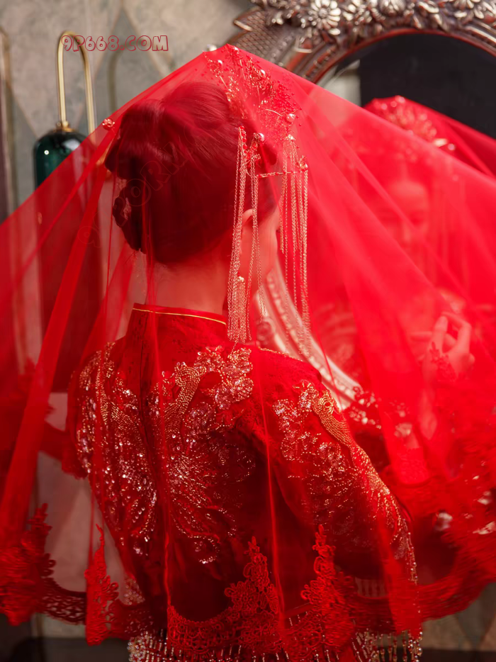 1、把酒店套房装修成新婚房间,“朵朵”新娘身穿“新娘禾秀服”在婚床上,头戴红纱,静静等待新郎入洞房;